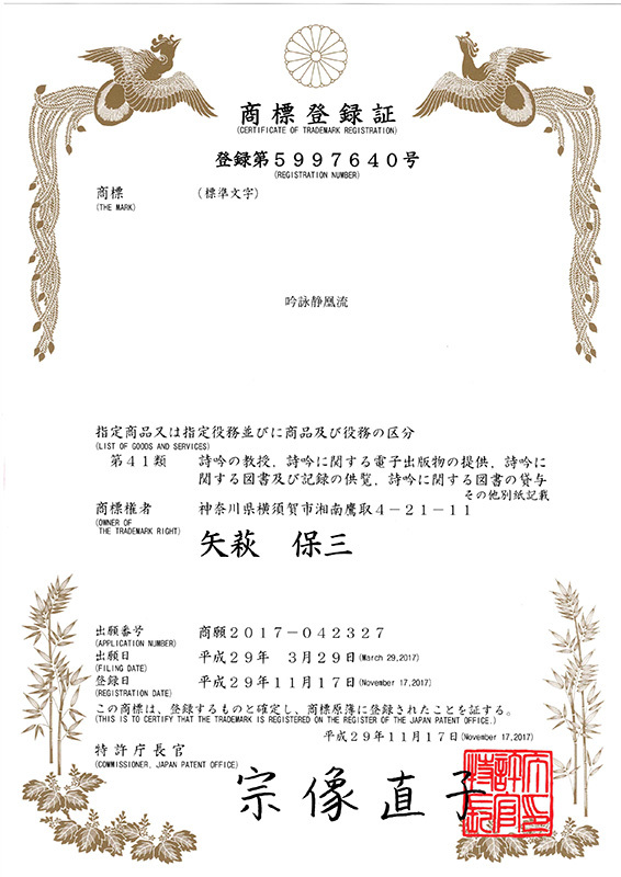 「吟詠静凰流」の商標(名称)については、下記商標権登録がなされており。その権利は三代目宗家 矢萩 鳳祥が有するものであり。使用にあったって許可なく使用してはならない。