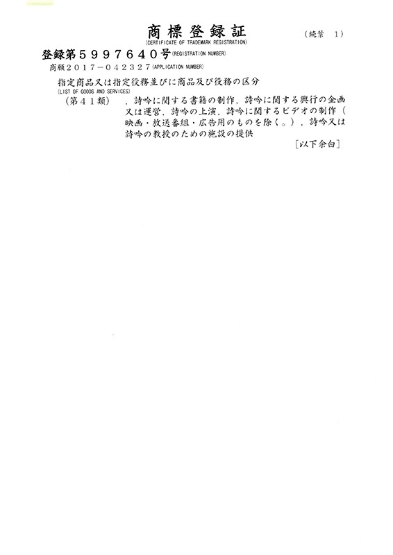 平成29年12月、特許庁へ申請していた『吟詠静凰流』の商標登録が完了し、商標権者となる。
